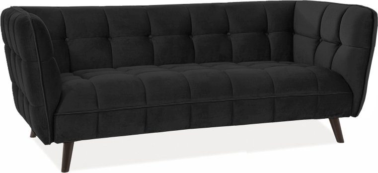 Soffa i bokträ och plywood. Klädd med polyestertyg i sammetsimitation.
