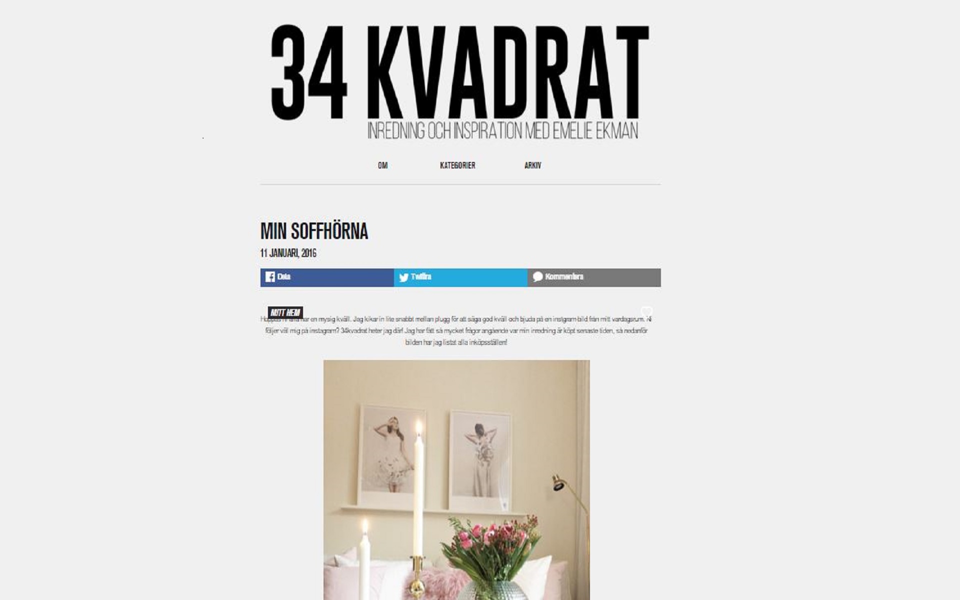 Emelie som driver bloggen 34 kvadrat Inredning & Inspiration har ett intresse utöver det vanliga för inredning. Vi och många andra följer hur den egna lyan utvecklas och förnyas - ett litet drömhem i guld, vitt och rosa! Emelie bjuder inte bara på sitt eget hem utan också inredningsinspiration för compact living, massor av tips och andra vackra hem som hennes säkra öga har valt ut. Själv drömmer hon om större inredningsprojekt och det blir säkert lika roligt att följa den dagen hon tar sig an det.