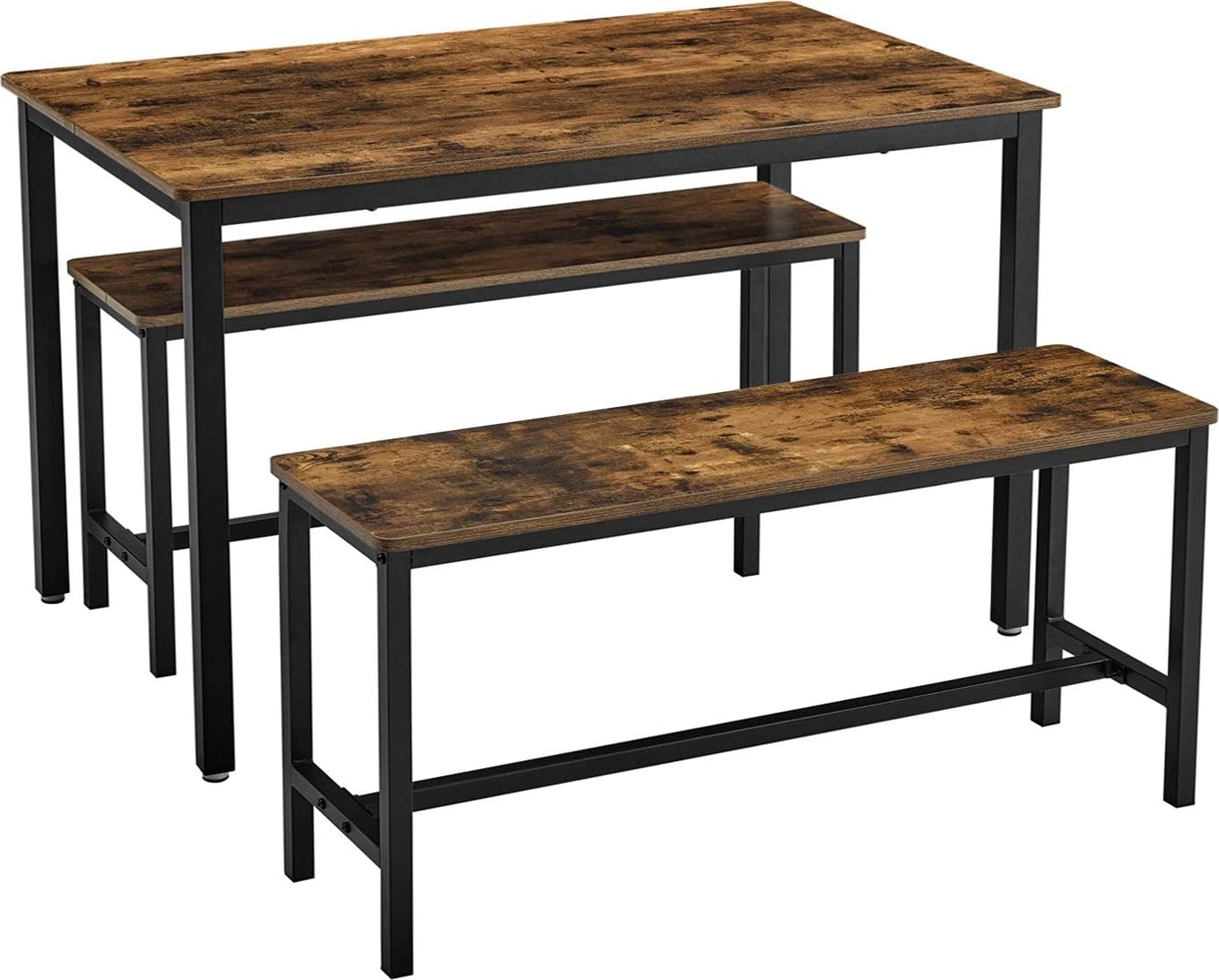 Matbord med 2 st sittbänkar. Ben av stål och bordsskiva/sitsar av spånskiva. Bänkarna klarar av en vikt av 100 kg och kan förvaras under bordet när de inte används.