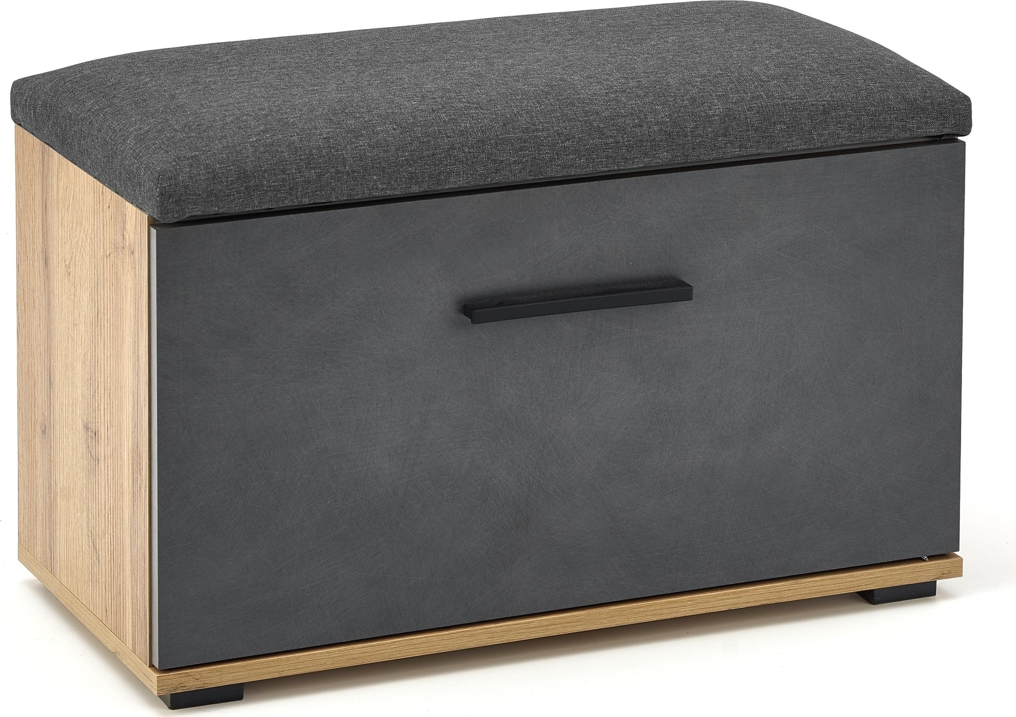 Ett härligt skoskåp med en modern design. Skoskåpets design gör så att den lätt kan ersätta skohyllan genom att gömma undan skorna för mer plats, samt med den praktiska och behagliga sittdynan. Själva skåpet är tillverkad i laminerad MFP (premium träskiva) med en högblank finish, och den är klädd med ett behagligt tyg med detaljer i kromad metall.