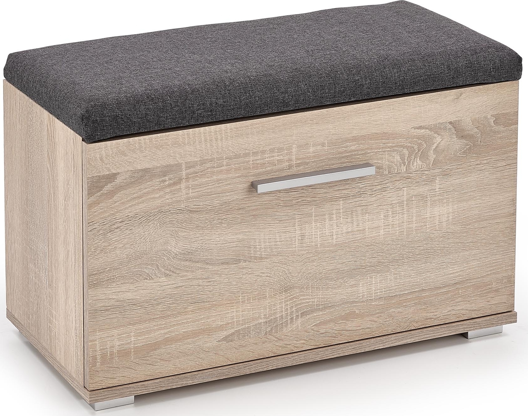 Ett härligt skoskåp med en modern design. Skoskåpets design gör så att den lätt kan ersätta skohyllan genom att gömma undan skorna för mer plats, samt med den praktiska och behagliga sittdynan. Själva skåpet är tillverkad i laminerad MFP (premium träskiva) med en högblank finish, och den är klädd med ett behagligt tyg med detaljer i kromad metall.