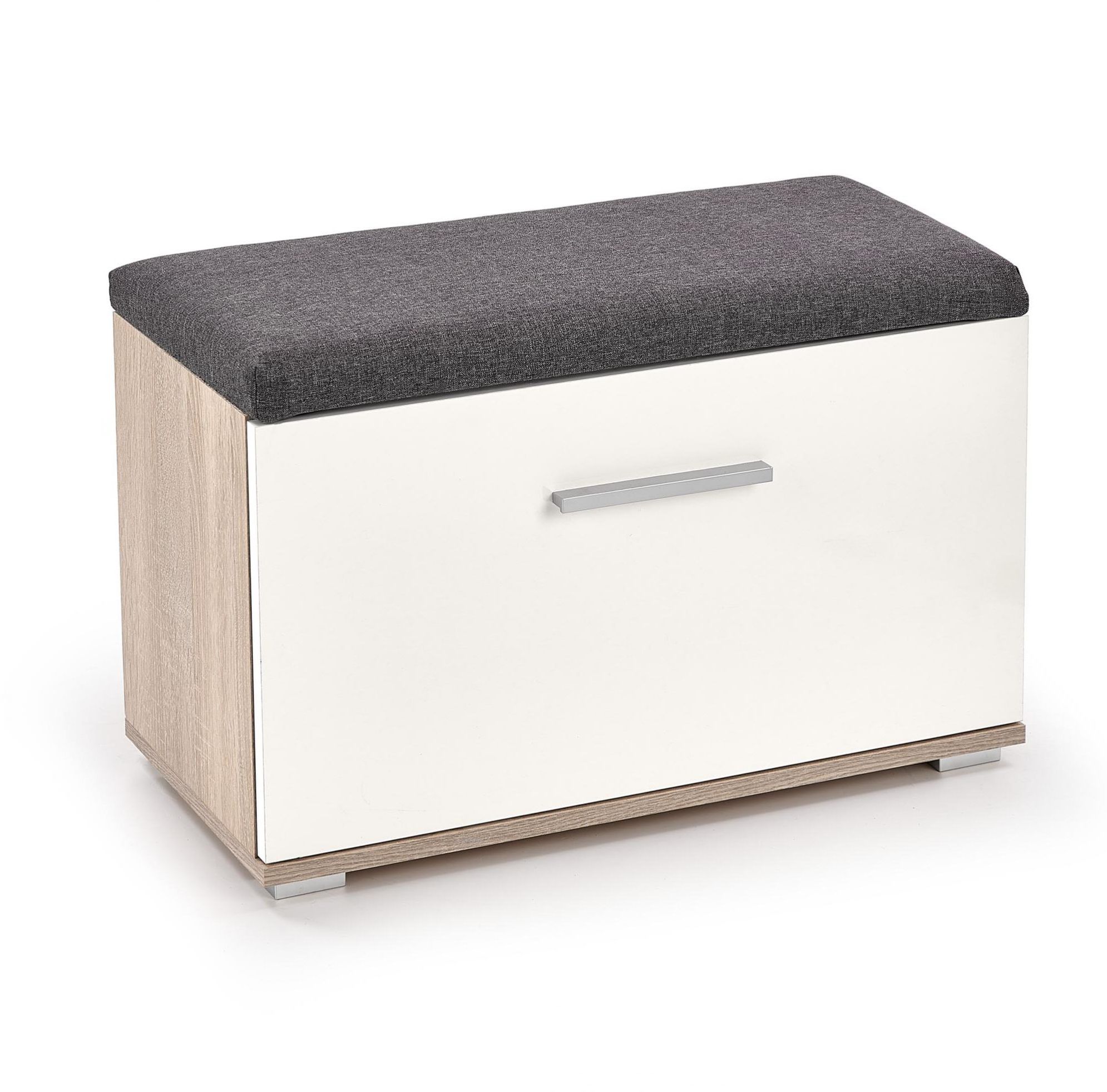 Ett mysigt skoskåp med en modern design. Skoskåpets design gör så att den lätt kan ersätta skohyllan genom att gömma undan skorna för mer plats, samt med den praktiska och behagliga sittdynan. Själva skåpet är tillverkad i laminerad MFP (premium träskiva) med en högblank finish, och den är klädd med ett behagligt tyg med detaljer i kromad metall.