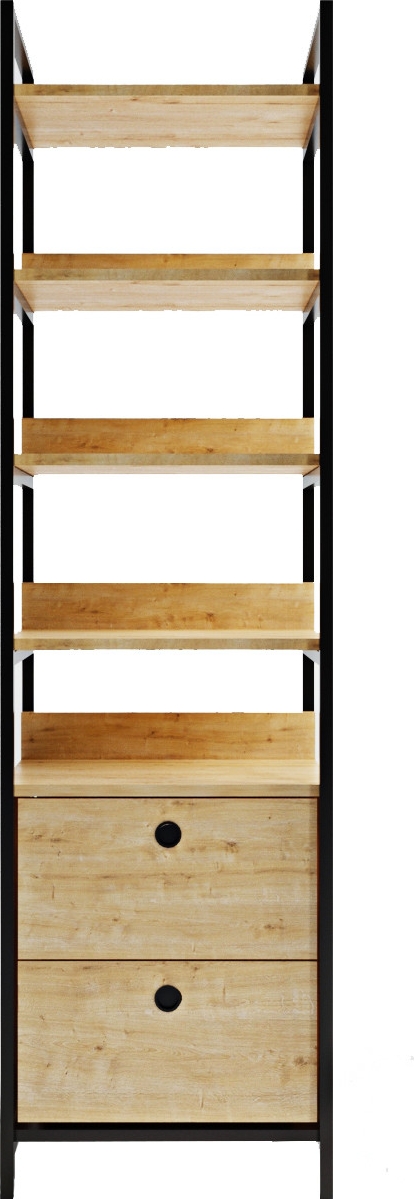 Hylla av melaminbelagd spånskiva och metall med lådor.