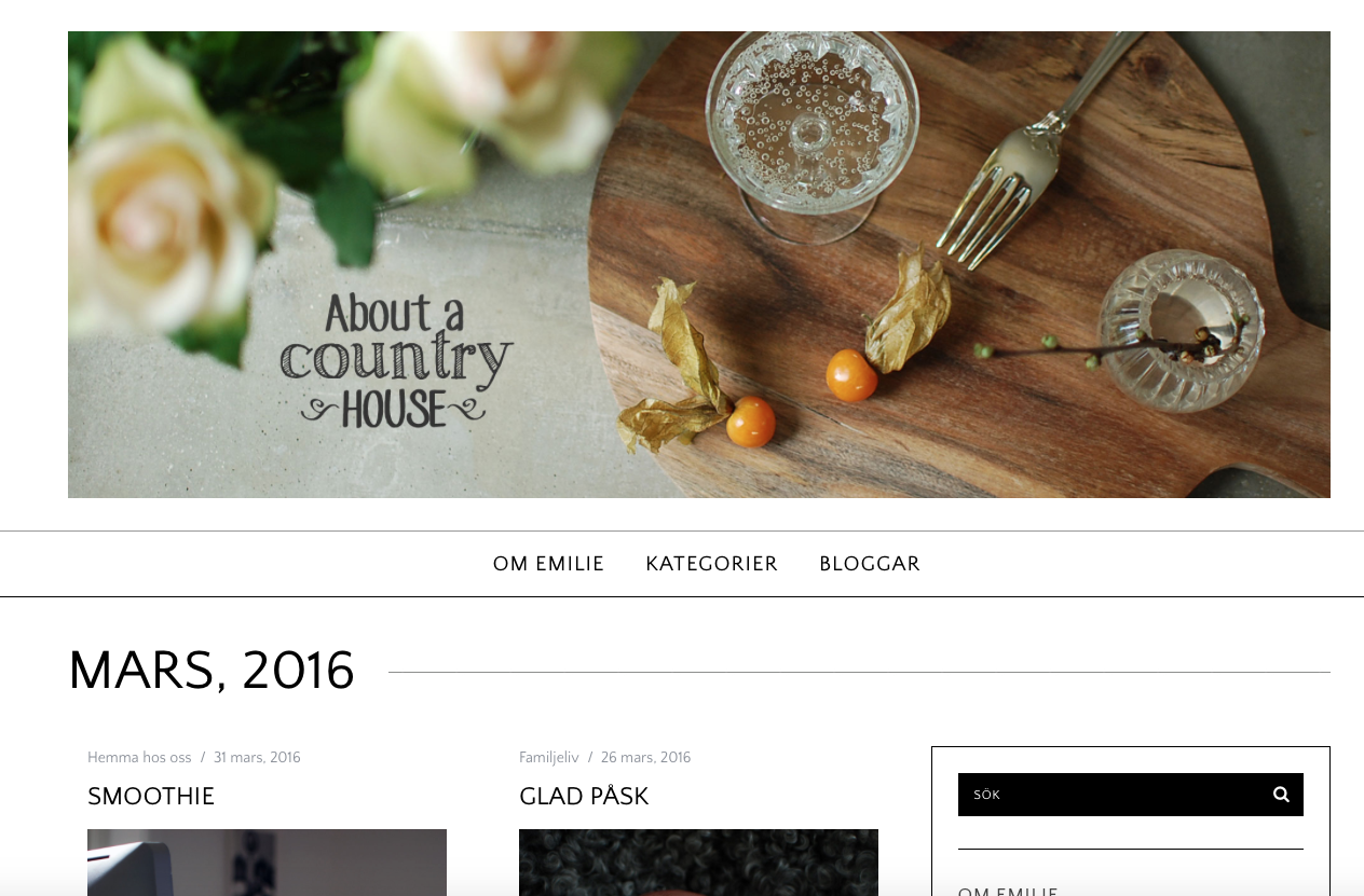 Emelie och hennes man hittade hem när den lilla gården byggd 1932 på västkusten blev till salu de slog till direkt och fick på köpet utsikt över hage, åkrar, ängar och en havsvik. I huset fanns redan bland annat en bakugn, framtagna plankgolv, en fin stockvägg och mycket andra fint renoverade detaljer. I bloggen About A Country House får vi följa familjelivet på gården hur huset anpassas efter familjens stil, glasveranda och badrum byggs och vilket badrum sedan för de som gillar badkar är det en dröm. Det finns ett klart ekotänk med att måla miljövänligt, odla mijöljövänligt och plastsanera. Stilen är vacker vintage uppblandad som livet med både ärvda, nya och loppisfyndade ting.