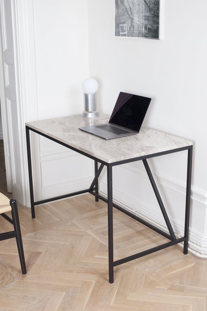 Accent skrivbord är stilsäkert och modernt. Inredd snyggt med detta skrivbord med toppskiva i marmor och underrede i svart metall. Finns flera olika färger att välja på toppskivan.