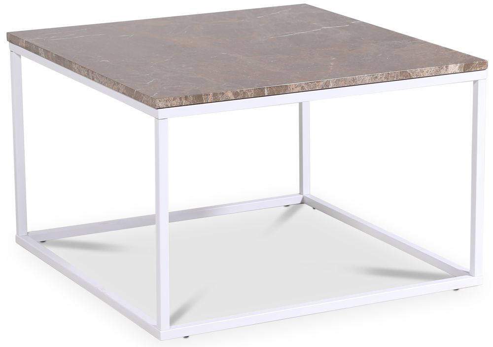 Accent soffbord med en brun äkta marmorskiva och underrede i vit metall. Accent är ett stilrent bord med vacker design och har en mycket lång hållbarhet. Accent är ett väldigt prisvärt soffbord.