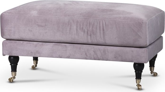 Fotpallen finns i ett puderrosa mjukt sammetsliknande tyg. Benen är svarta med mässingsfärgade hjul.
