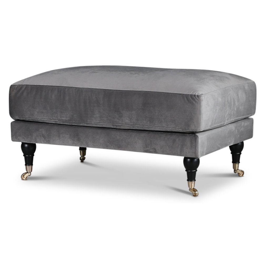 Fotpallen finns i ett silvergrått mjukt sammetsliknande tyg. Benen är svarta med mässingsfärgade hjul.