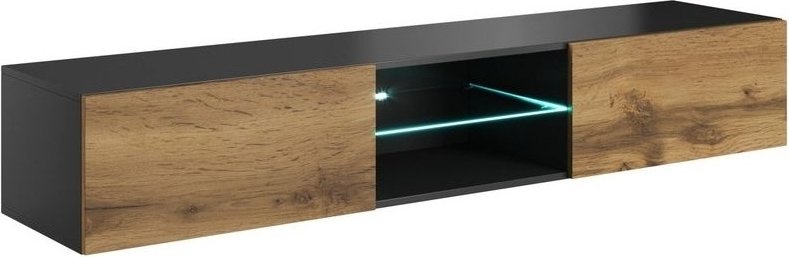 En mysig TV-bänk med en modern design. Bänken är tillverkad av laminerad MFP (premium träskiva) och spånskiva med en blandning av matt och högblank finish. Bänken har en praktisk underhylla av glas för smart förvaring av elektronik och två sidoskåp med push-click funktion för övrig förvaring.