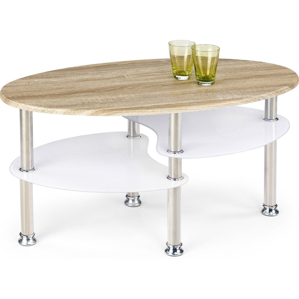 Ett härligt soffbord med en modern design. Underredet är tillverkat i kromad metall och bordsskivan i MFP (premium träskiva) med ett härligt ek laminat. Praktiskt tvådelad underhylla i vitt glas för smart förvaring.