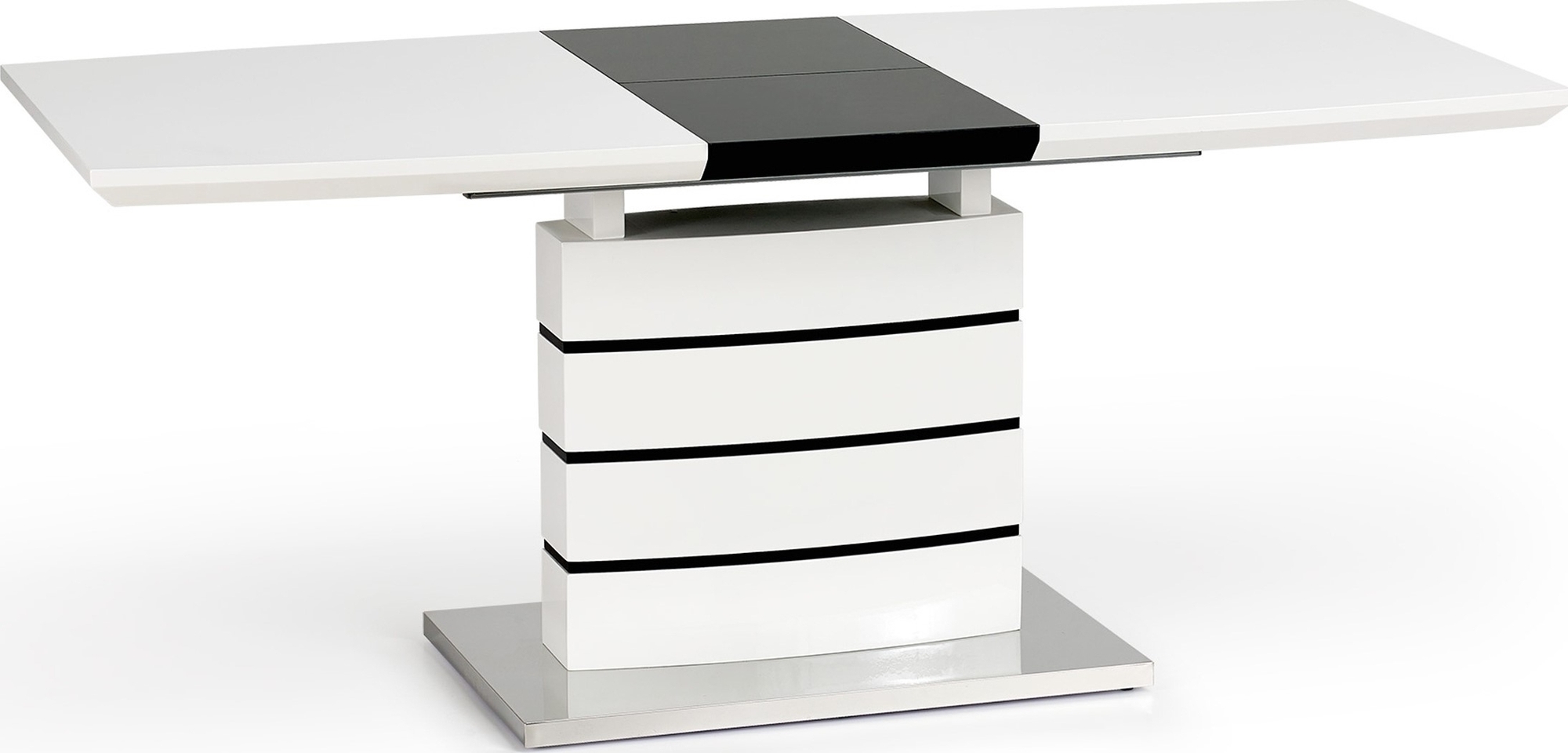 Ett elegant matbord med en modern design. Underredet är tillverkat i lackerad & kromad metall och bordsskivan i svart & vitlackerad MFP (premium träskiva). Bordet kan lätt förlängas från 140 cm till 180 cm, perfekt när man har ett lite större sällskap.