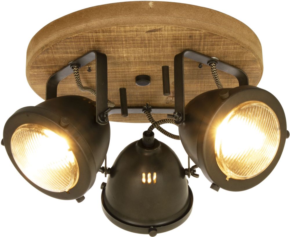 Spotlight i metall med järngrå behandling och takplatta i trä. Lätt att montera fast i taket.