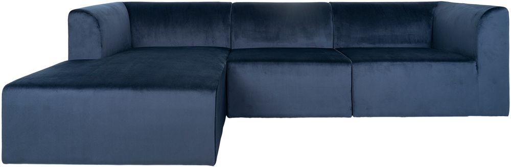 Vänstervänd soffa i mörkblå velour.
