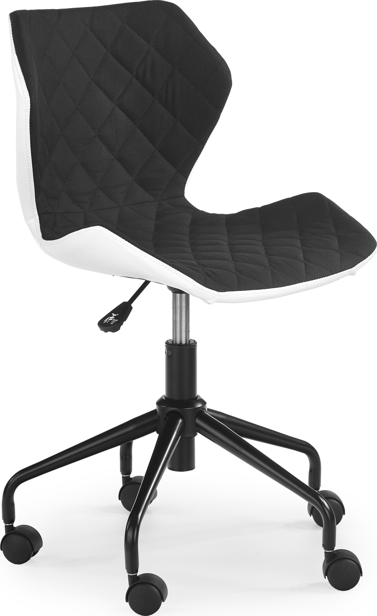 En härlig skrivbordsstol med en stilren design. Tillverkad i metall med detaljer i plast och en mycket behaglig klädsel i vitt konstläder och svart tyg. Sitsen är höj-och sänkbar samt lätt att förflytta med hjälp av hjulen under stjärnfoten.