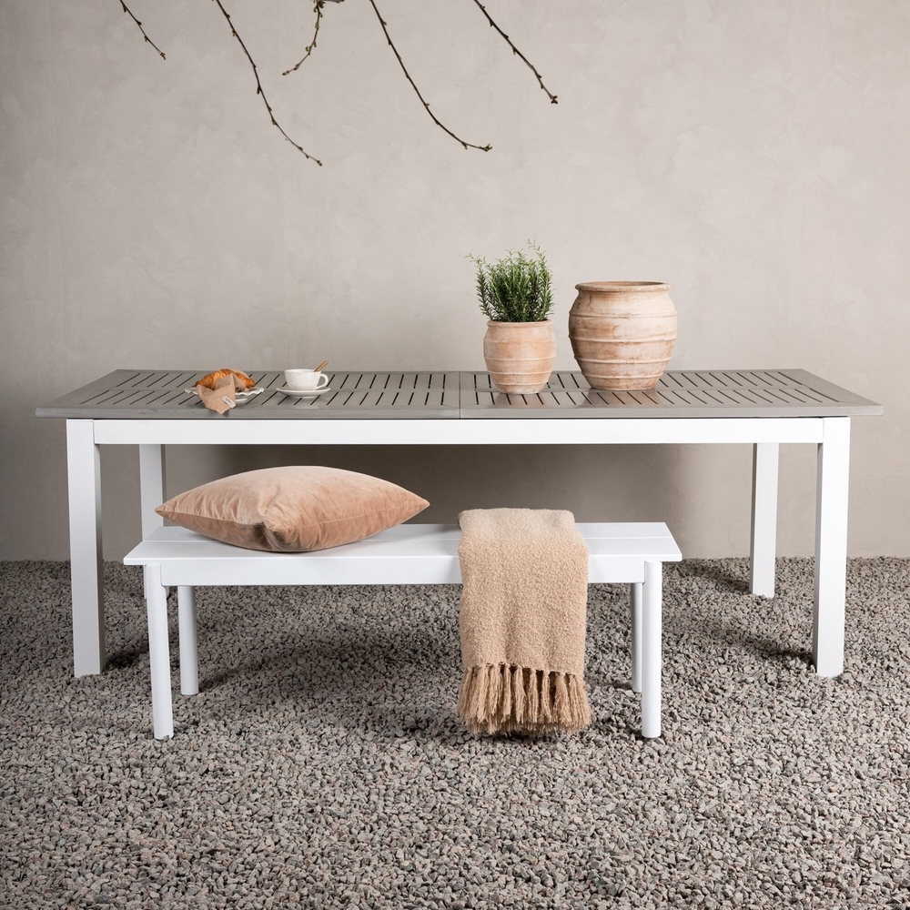 Albany matbordet är en smakfull kombination av elegans och funktionalitet, skapat för att lyfta dina utomhusmåltider till en ny nivå. Med en konstruktion av aluminium och aintwood, kombinerar detta bord hållbarhet med en tidlös design. I en stilfull grå och vit färgsättning blir Albany matbordet en attraktiv mittpunkt i din utomhusmiljö. Dess förlängningsbara design ger flexibilitet för olika sammankomster och skapar den perfekta platsen för alla att samlas för en trevlig middag. Aintwood-materialet ger en träliknande estetik utan bekymmer för underhåll, medan aluminiumet garanterar långvarig motståndskraft mot väder och vind. Albany är inte bara ett bord; det är en inbjudan till gemenskap och minnesvärda stunder utomhus. Samla dina nära och kära runt Albany matbordet och njut av varje ögonblick av trevlig samvaro. Med dess förlängningsbara funktion och vackra design blir detta bord hjärtat i dina utomhusmåltider och en plats där minnen skapas