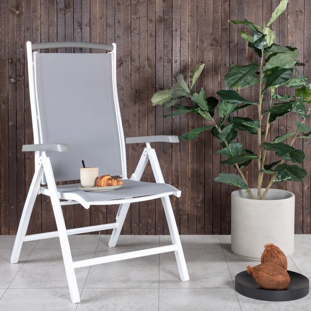 Albany - lika bekväm som praktisk och stilren! En grå 5-positionsstol med läckra armstöd för extra komfort. Ryggstödet är fällbart för optimal bekvämlighet. Stolen gör sig lika bra i trädgården som ute på altanen. Njut av sommaren på allra bästa sätt! Skötselråd: Textilene är ett syntetiskt tyg som är tillverkat av PVC-behandlad polyester. Materialet är vattenresistent och UV-behandlat för att motverka solens blekning. Rengöring bör göras ungefär en gång i månaden, använd en fuktig trasa och torka av.