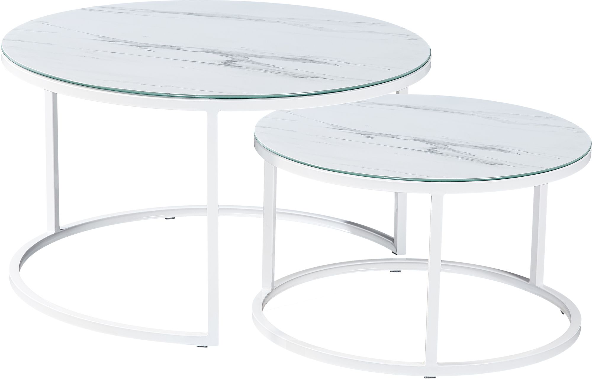 Soffbord i set med toppskivor av marmormönstrat vitt glas, underrede av vit metall.
