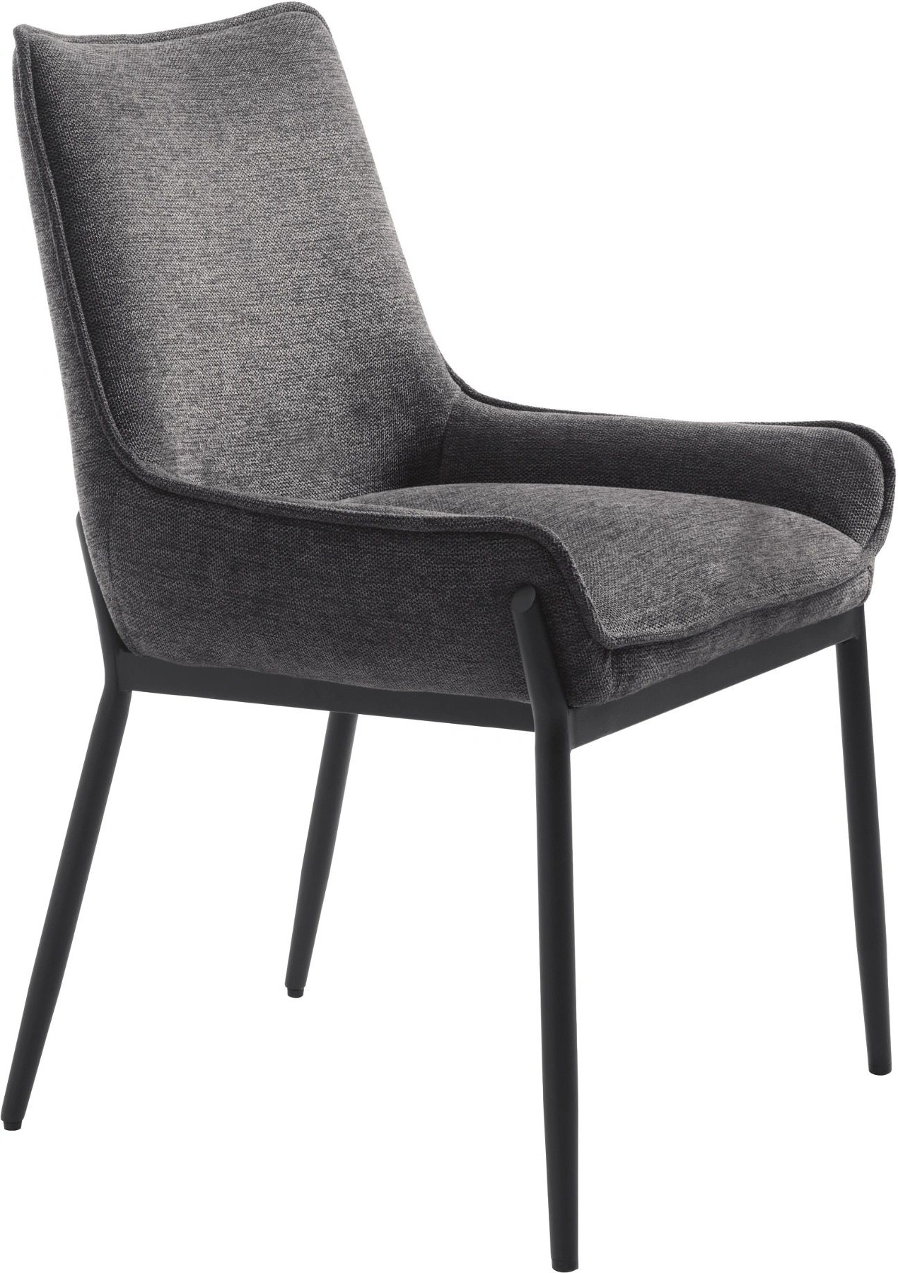 Stolens ram är gjord av solid metall med en svart finish som kompletterar sitsens mörkgrå färg. Stolen har en sittkomfort som är idealisk både för vardagsbruk och längre middagarna med gäster. Klädd med ett tyg som är slitstarkt och motståndskraftigt mot normalt slitage. Detta säkerställer att stolen behåller sitt attraktiva utseende över tid.