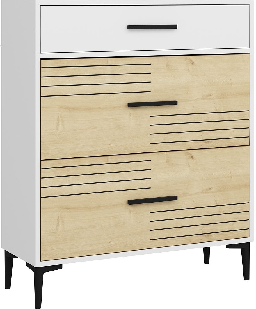Byrå av melaminbelagd spånskiva.