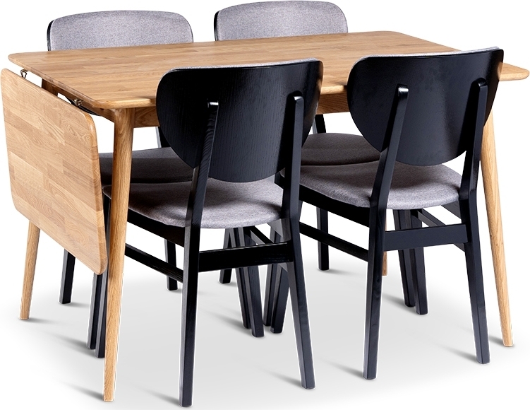 Stilfull matgrupp i massiv i oljad ek och 4 svarta stolar i massiv ask. Hängklaffen som alltid sitter på sidan gör att bordet enkelt kan förlängas vid behov.
