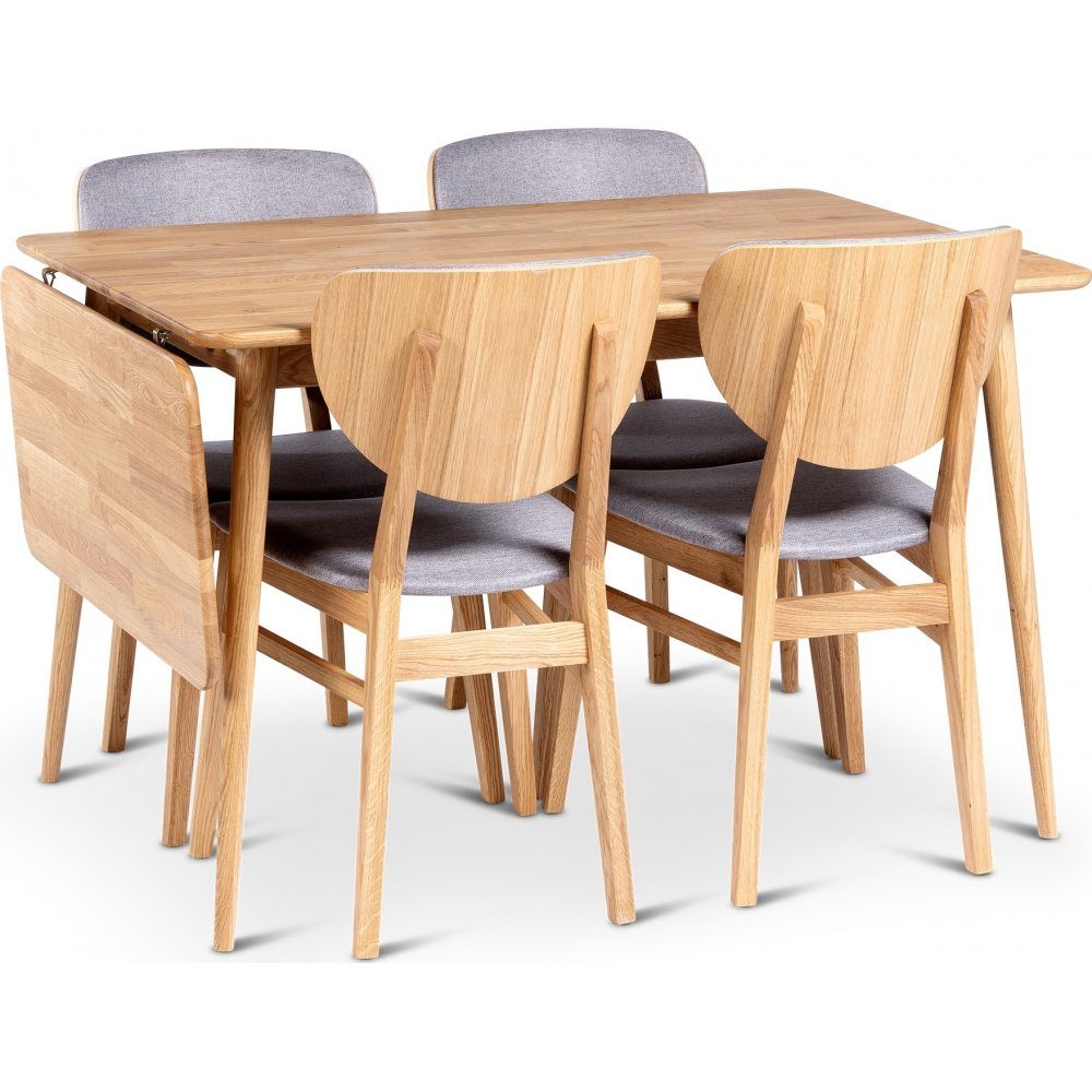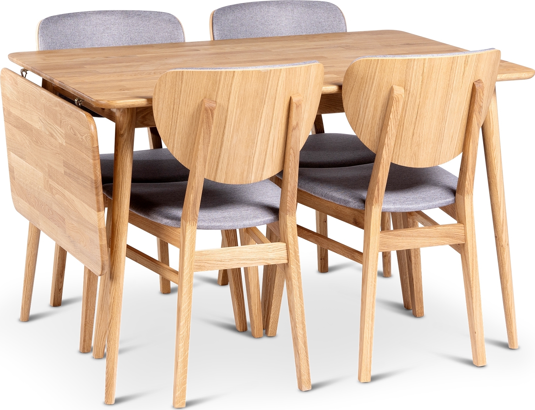 Stilfull matgrupp i massiv i oljad ek och 4 matchande stolar i massiv ek. Hängklaffen som alltid sitter på sidan gör att bordet enkelt kan förlängas vid behov.