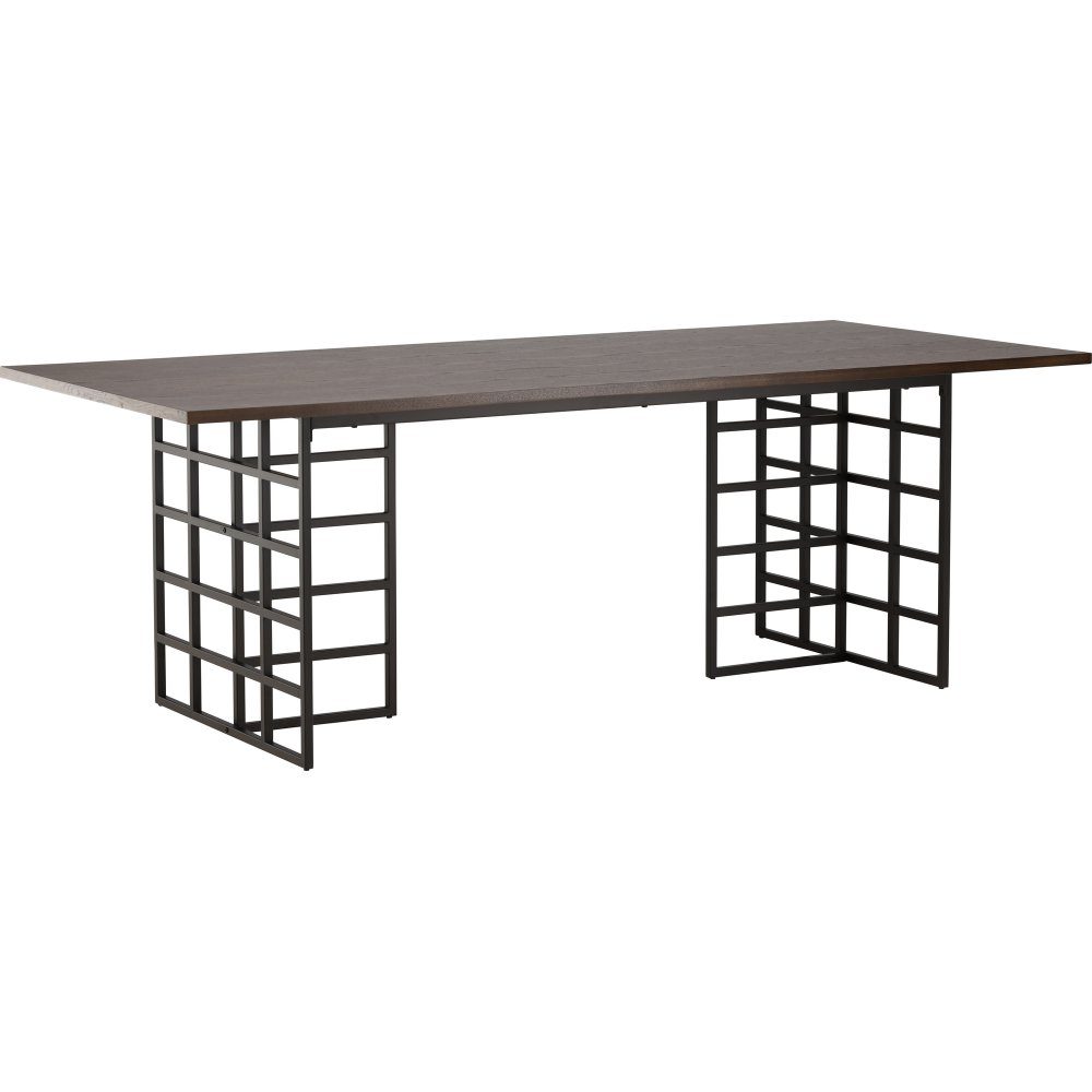 Matbord som imponerar med sin modemedvetna design. Detta trendsäkra matbord har en vacker brunfärgad, rektangulär bordsskiva i MDF med ekfanér och två dekorativa stommar i svart metall med industriell design. Det här matbordet är perfekt om du vill skapa en inbjudande atmosfär i ditt hem. Matcha med ett par bekväma matstolar så får du den perfekta kombinationen av stil och komfort.