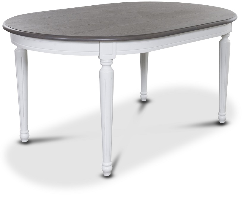 Alexandra ovalt matbord är exklusivt och robust. Matbordet har en toppskiva i grå vintagefärg med arbetad och fasad kant. Det medföljer 1 st iläggsskiva som förlänger bordet från 105 cm runt bord till 155 cm ovalt matbord.