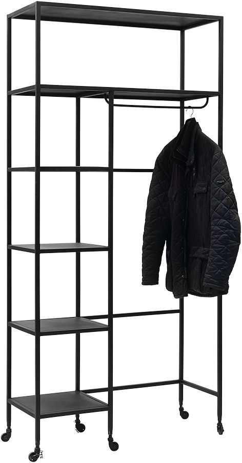 En fin klädhängare med en modern design. Klädhängaren är tillverkad av svart metall, med hela 6 hyllplan för förvaring och en klädstång. Klädhängaren är även på hjul och kan förflyttas lätt vid behov.