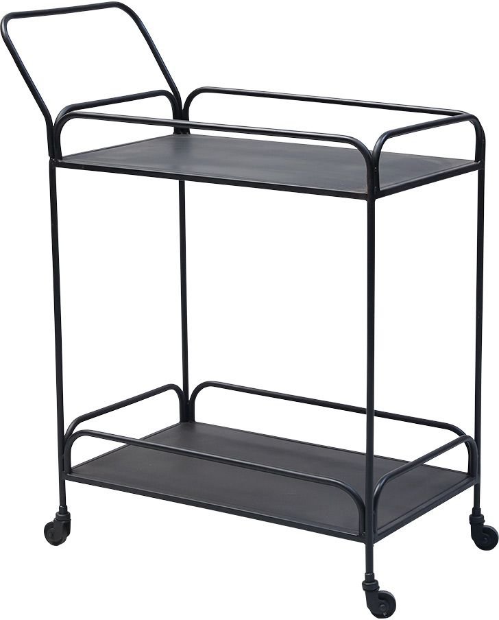 En snygg serveringsvagn med en modern design. Vagnen är tillverkad i svart metall och har 2 hyllplan med kantskydd för förvaring. Vagnen är även på hjul och är lätt att förflytta.