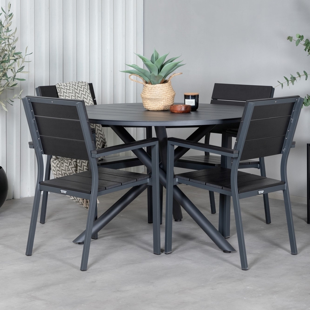 Läckert matchande matgrupp för sommarens alla måltider - passar lika bra i uterummet som på altanen! Levels är en praktisk karmstol i svart aluminium med svart sits och ryggdel i smäcker Aintwood. Stolen är stapelbar, för smidig förvaring. Här tillsammans med vårt runda matbord Alma i svart aluminium. Skapa den perfekta sociala atmosfären på uteplatsen!