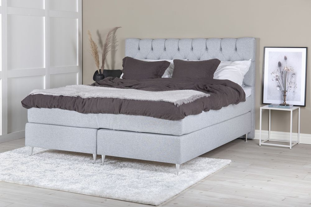 Den pikerade bäddmadrassen kommer i 160/180 cm och är uppbyggd av mikrofibervadd och kallskum. Sammantaget är sängen uppbyggd för att ge en skön sovkomfort samt ge ett enhetligt intryck i sin helklädda design. Hela sängen vilar på 12 cm höga champangeben i silvrig aluminium.