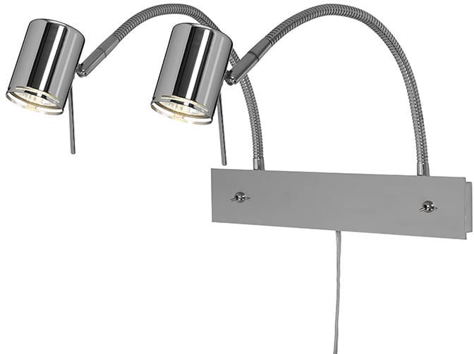 En härlig vägglampa med en futuristisk design. Tillverkad i kromad metall med trå flexarmar och reglerbara huvuden. Två separata strömbrytare på basen.