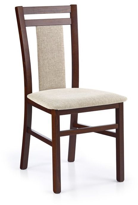En klassisk matstol med en stilren design. Tillverkad i massiv bok med ett härligt valnöt utförande och sitsen är klädd med ett mycket behagligt beigt tyg för den maximala komforten.