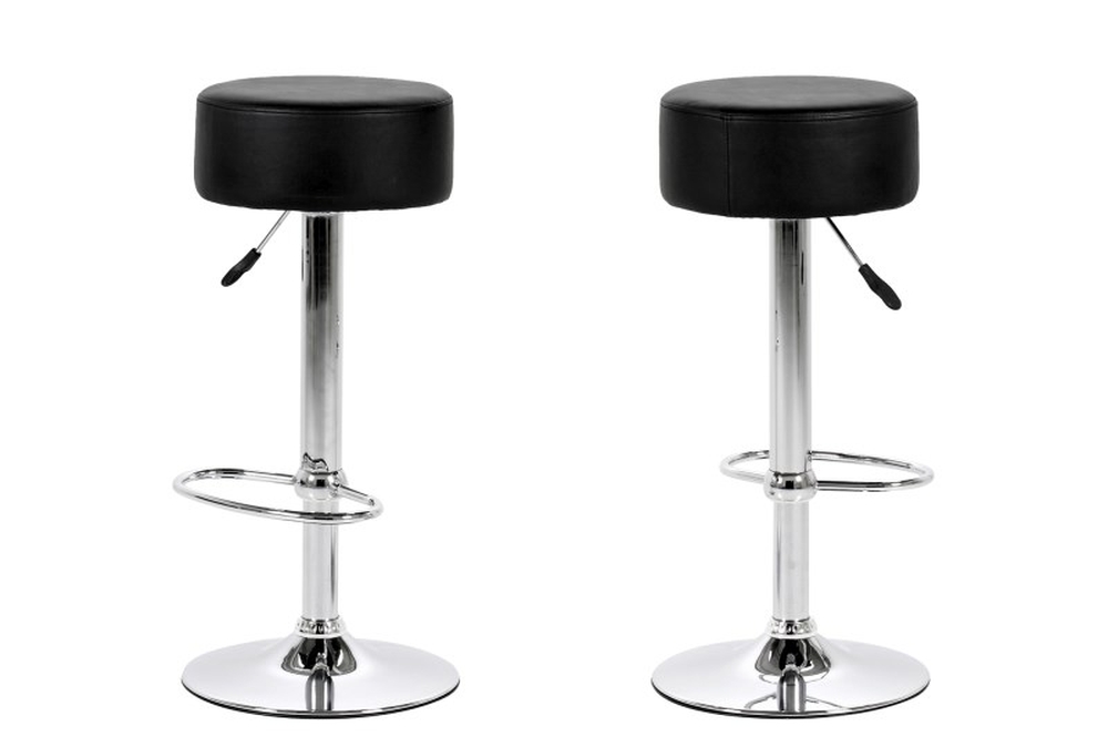 Klassisk barstol med stor mjuk sits klädd i svart konstläder (PU). Trumpetfot med fotstöd av kromad metall och sitsen är höj och sänkbar tack vare den TÜV märkta gasfjädringen.