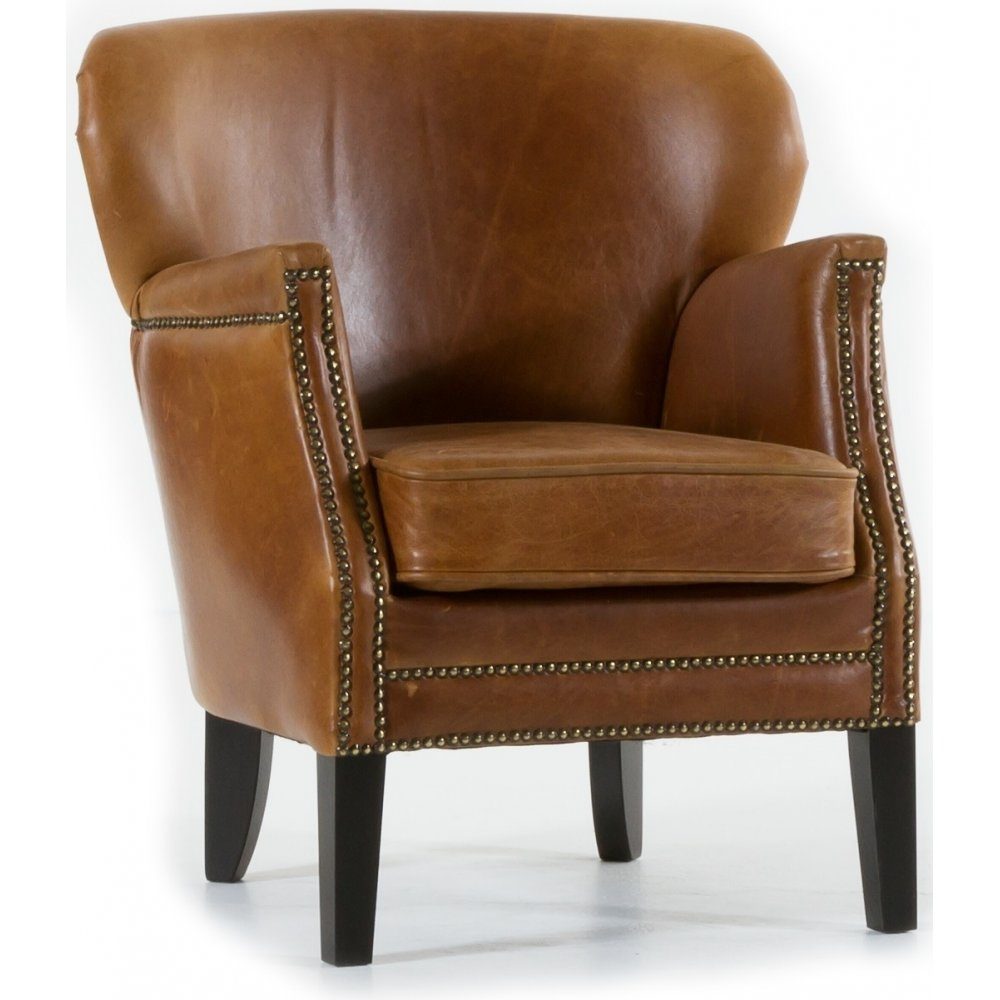 Ambassadör professor fåtölj har en klassisk design med ett antikbehandlat brunt anilinskinn för att få den rätta vintagekänlan. De melerade nitarna klär fåtöljen som en snygg detalj.