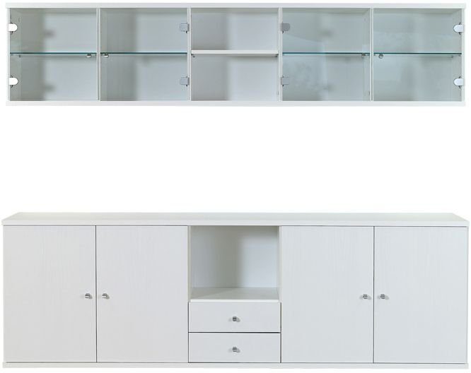 Ett mysigt väggskåp med en modern design. Väggskåpen är i två delar. Den understa delen är tillverkad av MDF med vit melamin och metallhandtag, med två dubbelskåp i ändarna och två lådor samt ett öppet hyllplan i mittenpartiet. Den övre delen av tillverkad av MDF med vit melamin och fyra skåp med dörrar i härdat glas samt hyllplan i skåpen i glas. I mitten är där två öppna hyllplan.
