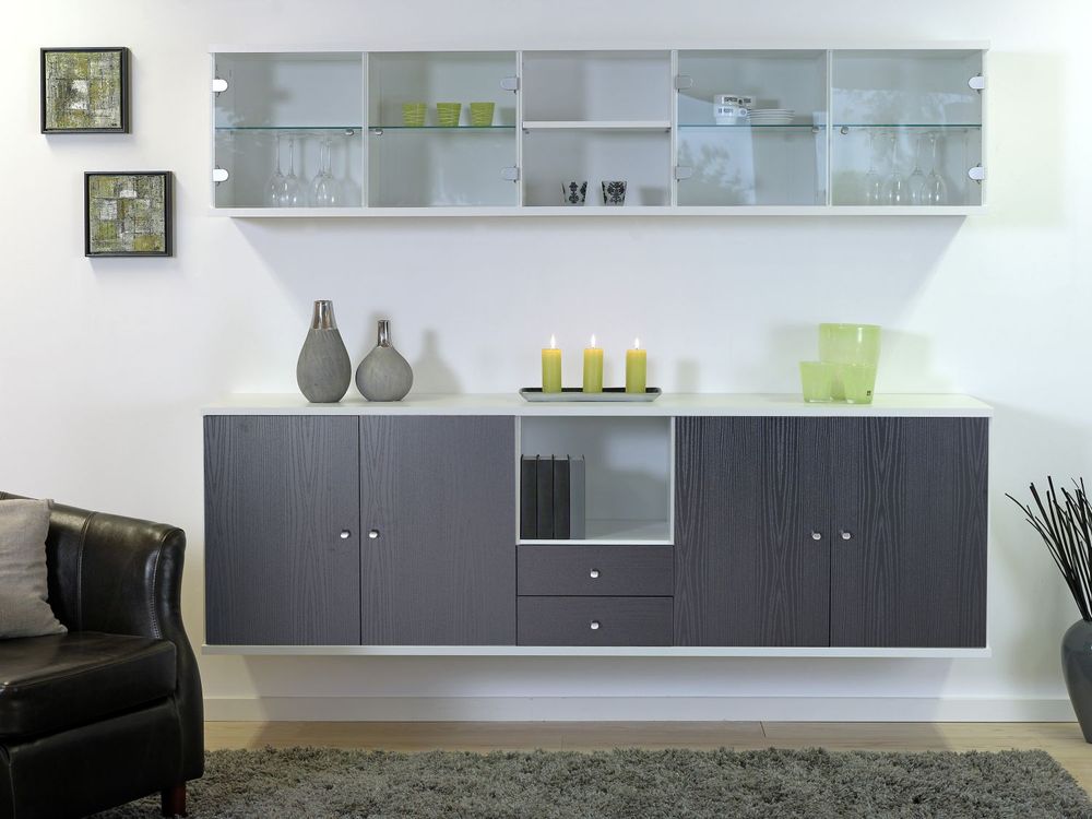 Ett fint väggskåp med en modern design. Väggskåpen är i två delar. Den understa delen är tillverkad av MDF med vit melamin och metallhandtag, med två dubbelskåp i ändarna och två lådor samt ett öppet hyllplan i mittenpartiet, skåpsdörrarna samt fronten på lådorna har ett snyggt svart ask utförande. Den övre delen av tillverkad av MDF med vit melamin och fyra skåp med dörrar i härdat glas samt hyllplan i skåpen i glas. I mitten är där två öppna hyllplan.