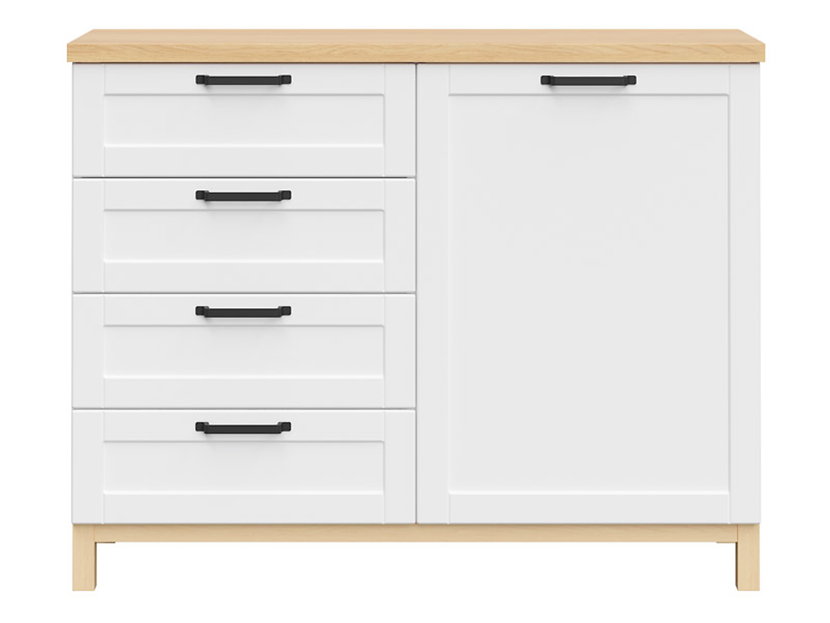 En fin byrå i vitt med bordsskiva och ben i ek. Byrån har fyra praktiska lådor och ett skåp med metallhandtag. Kombinationen av vitt och ek går aldrig ur tiden och byrån kommer ge en stilren och en tidlös känsla i ditt hem.