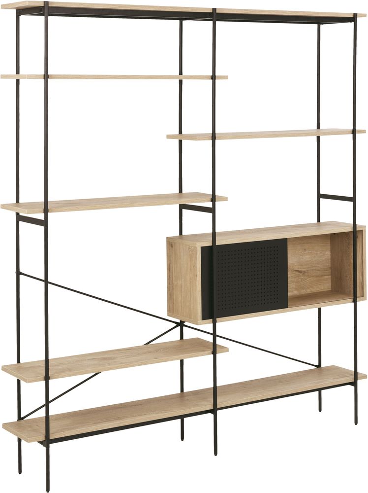 Bokhylla med ram tillverkad i svart pulverlackerad metall och hyllplan av MDF med ek-imitation.