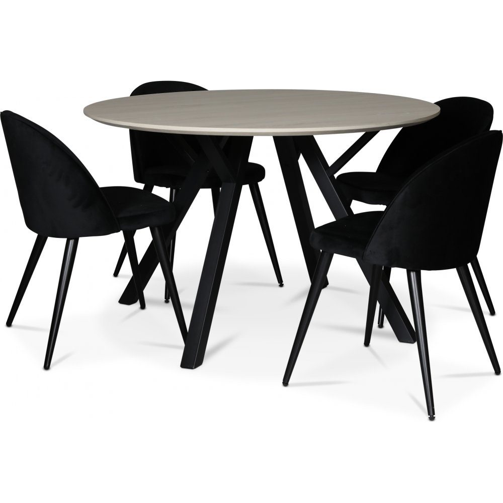 Matgrupp från Skånska Möbelhuset, Runt matbord 120 cm i diameter med svarta metallben och en whitewashfolierad toppskiva. Fyra stycken Alice stolar i svart sammet med svarta metallben.