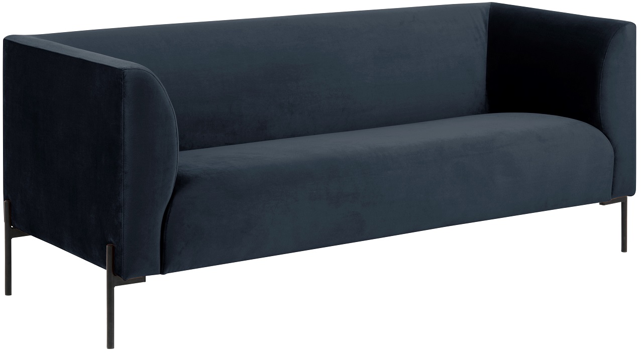 Modern soffa med raka och enkla linjer. Soffan levereras i ett mjukt och slitstarkt tyg, Letto mörkblå 1022 velour, med svarta metallben. Stoppning i sittdelen är 45kg Kallskum av högkvalite.