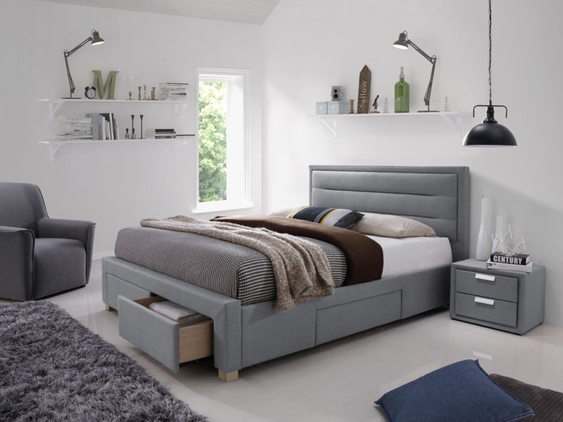 En snygg sängram med en modern design. Ramen är tillverkad av trä och är klädd med ett mycket behagligt tyg för maximal komfort. Ramen har även ett flertal inbyggda lådor för smart förvaring av exempelvis sängkläder.