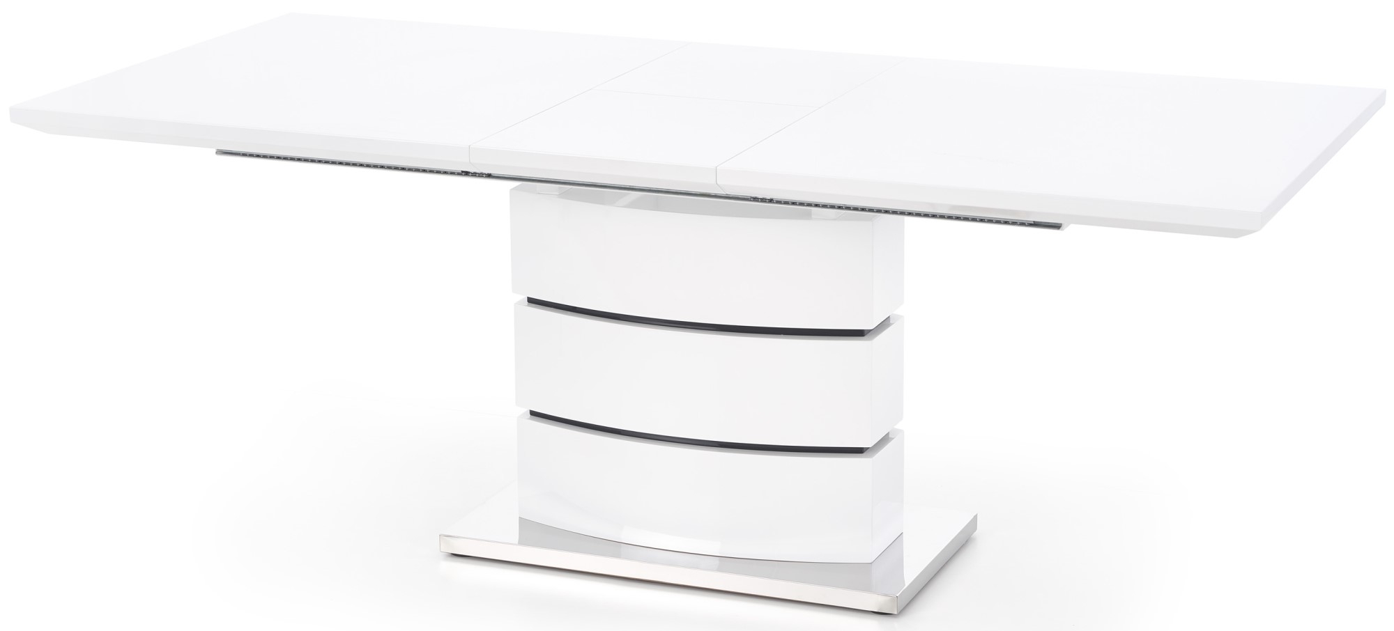 Ett elegant matbord med en modern design. Underredet är tillverkat i lackerad & kromad metall och bordsskivan i vitlackerad MFP (premium träskiva). Bordet kan lätt förlängas från 160 cm till 200 cm, perfekt när man har ett lite större sällskap.
