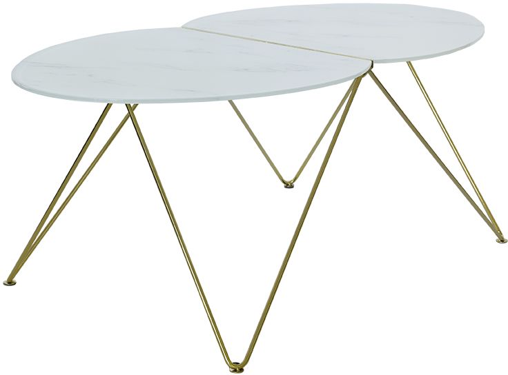 Soffbord med en modern design. Benen är av mässingsfärgad metall och bordsskivan är av glas med ett härligt vitt marmor mönster. Bordet är lätt att kombinera med dem flesta soffgrupperna!