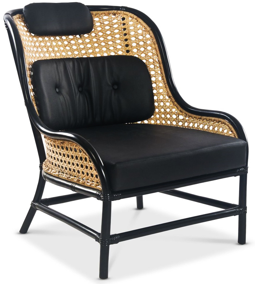 Fåtölj med stomme av svart rotting, naturfärgad rotting i ryggen, bekväm svart sittdyna i PU ingår. En både rejäl och stilig fåtölj.