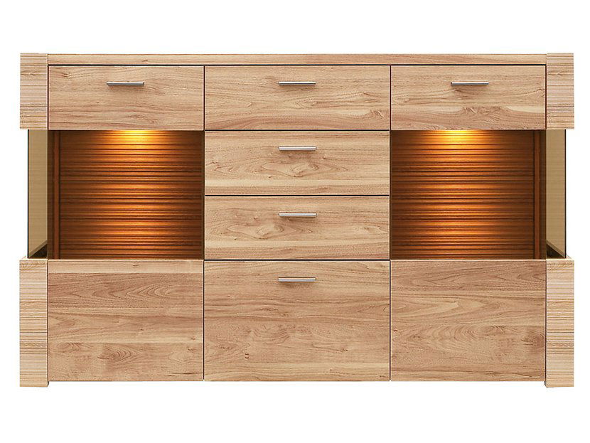 Pampigt sideboard i ljusträ-imitation med härdat glas och belysning. Erbjuder rikligt med förvaring i de sex lådorna samtidigt som prydnadssaker kan visas synligt och upplyst. Kombinera gärna med andra möbler i samma serie.