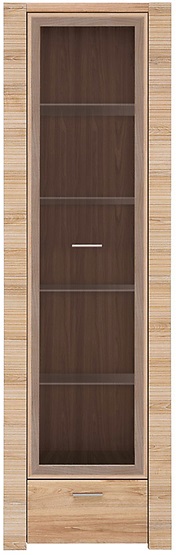 Elegant vitrinskåp i valnötsimitation med räflade kanter. Dörr i härdat glas och fem hyllplan i klarglas. Låda nertill för extra förvaring.
