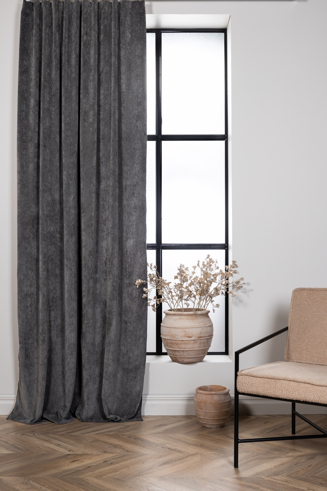 Gardinlängd i polyester med manchesterkänsla. Kombinera med en skir gardin i lager på lager eller använd gardinlängderna ensamma och sätt din egna touch på inredningen. Gardinerna har ett påsytt multifunktionsband som gör det möjligt att välja upphängningsmetod själv. Välj mellan fingerkrokar eller dold hälla.