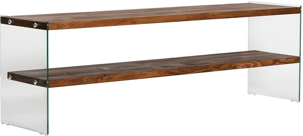 Mediabänk av trä och tempererat glas.