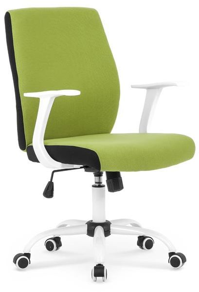En härligt kontorsstol med en modern design. Tillverkad i vit metall med detaljer i vit plast, och en mycket behaglig klädsel i svart & grönt tyg. Höj- och sänkbar sits med hjälp av spaken under sitsen och lätt att förflytta tack vare hjulen på stjärnfoten.